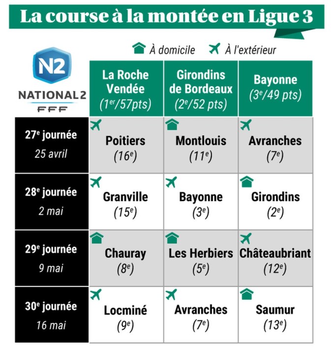L’objectif : Maintenir la pression sur le leader La Roche Vendée, au cas où, et garder le troisième Bayonne à distance en vue d’un potentiel repêchage en cas de relégations administratives… car à cinq points des Vendéens (qui vont chez le dernier Poitiers) et trois points devant les Basques (en voyage à Avranches, 7ème), les Girondins sont entre deux eaux sur cette fin de saison. Le succès à Dinan samedi dernier (1-3), une semaine après la nouvelle claque contre Lorient (2-3), permet d’entretenir un espoir d’accession directe et d’éviter un effondrement.